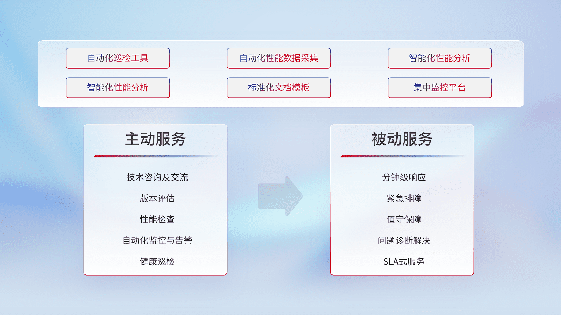 智能化工具和标准化文档,,,,保障服务质量,,,,提供主动服务(包含技术咨询、、、版本评估、、、性能检查、、、、自动化监控与告警、、健康巡检)和被动服务包含(分钟级响应、、、、紧急排障、、、、值守保障、、问题诊断解决、、、、SLA服务)。。。。