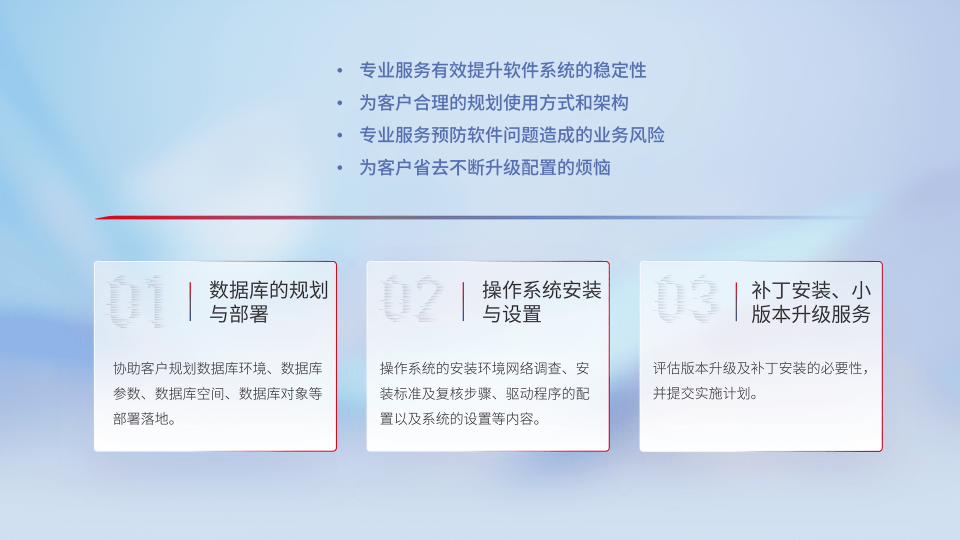 为客户提供软件规模升级、、快速部署、、按需配置的专业服务,,,从数据库的规划与部署到操作系统的安装与设置,,,再到补丁安装和小版本升级提供支持。。。